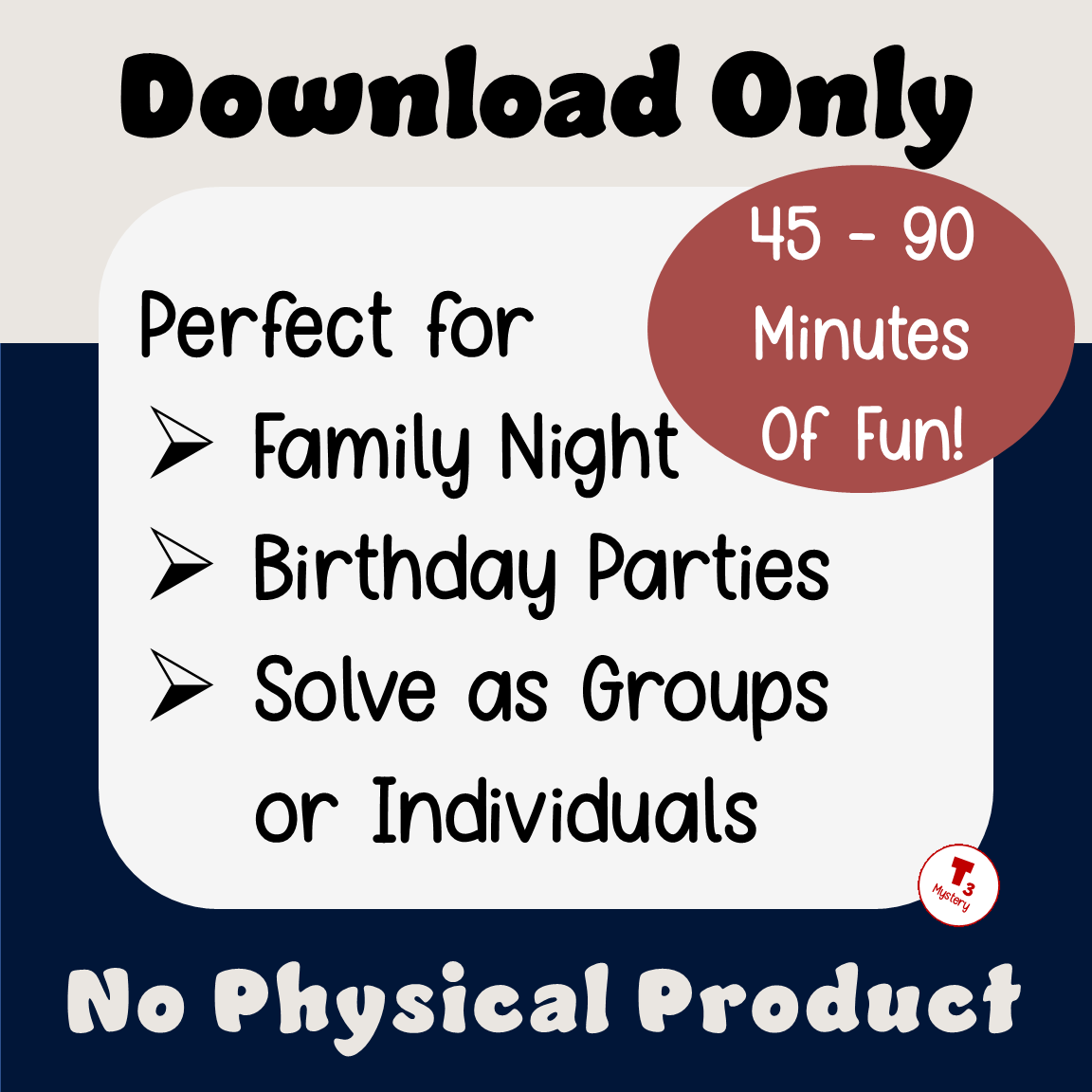 Escape Rooms Categories: All New Arrivals Christmas Halloween Outdoors Escape Rooms All New Arrivals Christmas Halloween Outdoors Santa Mystery, The Case of the Counterfeit Gifts Escape Room: DIY Printable Puzzle (Download ONLY) $9.99 Add To Cart Added! Rocky Beach Mystery Escape Room for Kids: Printable Puzzle Mystery (Download ONLY) $9.99 Add To Cart Added! Witch's Brew Escape Room for Kids: Printable Puzzle Mystery (Download ONLY) $9.99 Add To Cart Added! Sprite Mischief Escape Room for Kids: Printable Puzzle Mystery (Download ONLY) $9.99 Add To Cart Added! Gremlin Dilemma Escape Room for Kids: Printable Puzzle Mystery (Download ONLY) $9.99 Add To Cart Added! Camping Mayhem Escape Room for Kids: Printable Puzzle Mystery (Download ONLY) $9.99 Add To Cart Added!